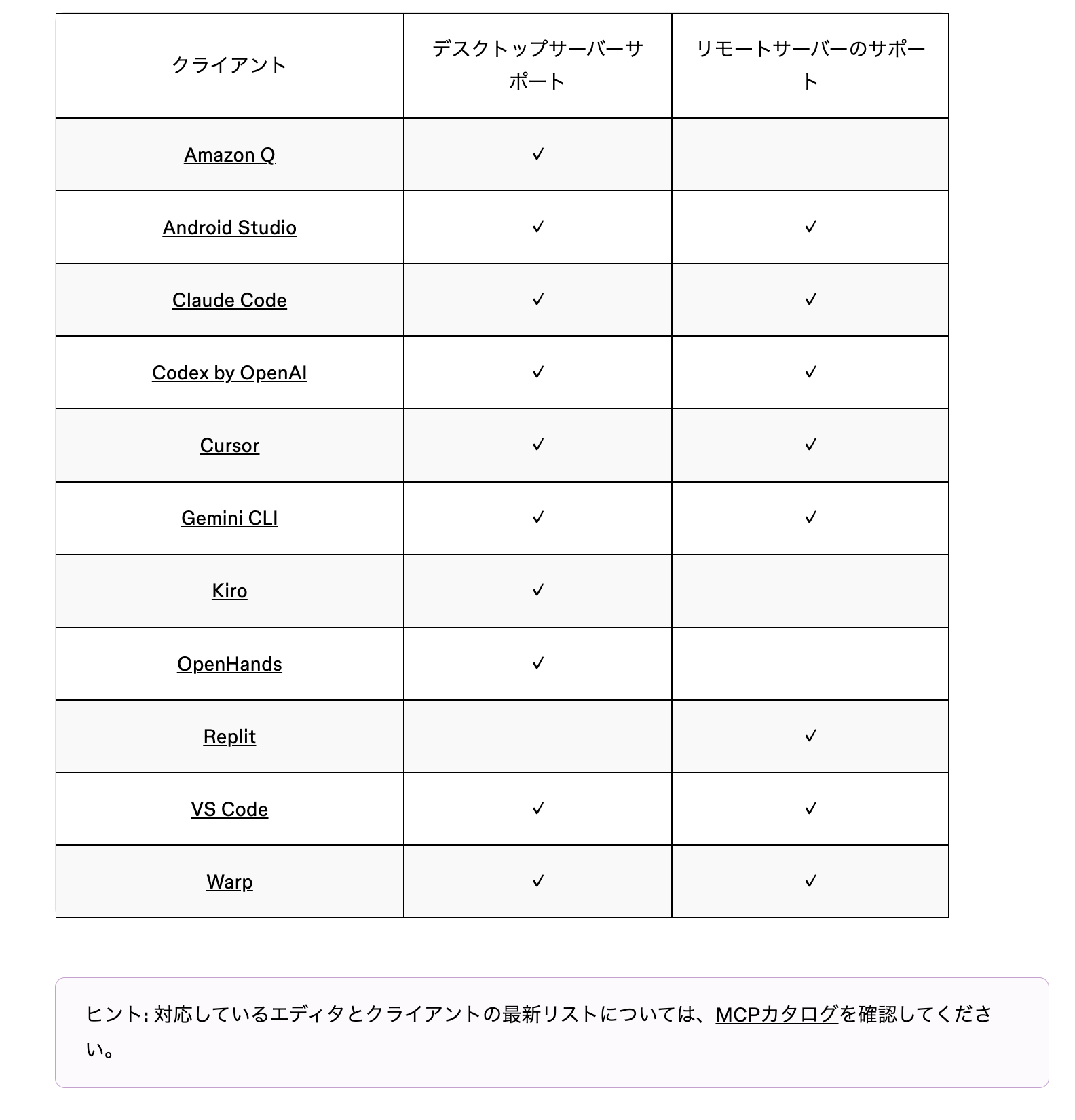 以下の表には Claude は載っていないが、表の下にある「MCP カタログ」を見ると Claude も対応されていることが確認できる。