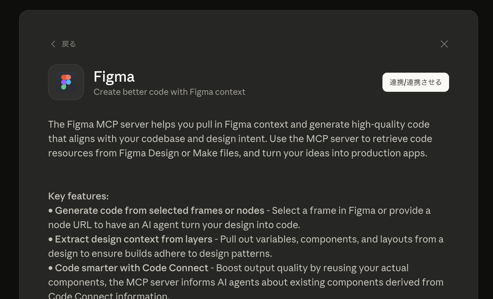 Figma のデスクトップアプリを使用したいので、Figma MCP サーバーの接続方法は「デスクトップMCPサーバー」で設定した。